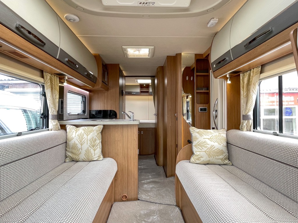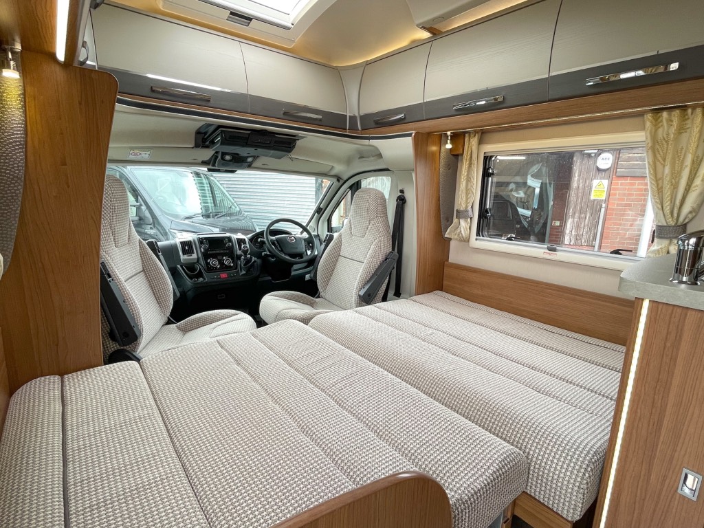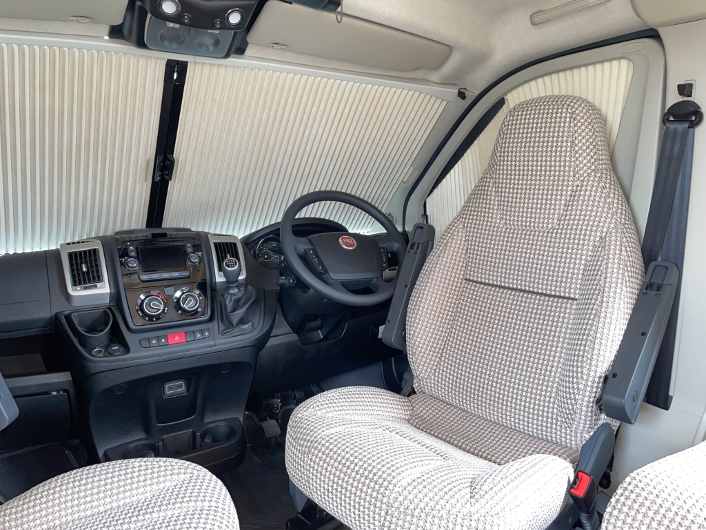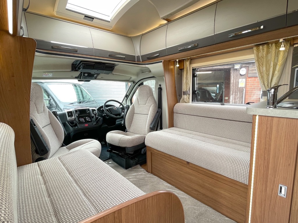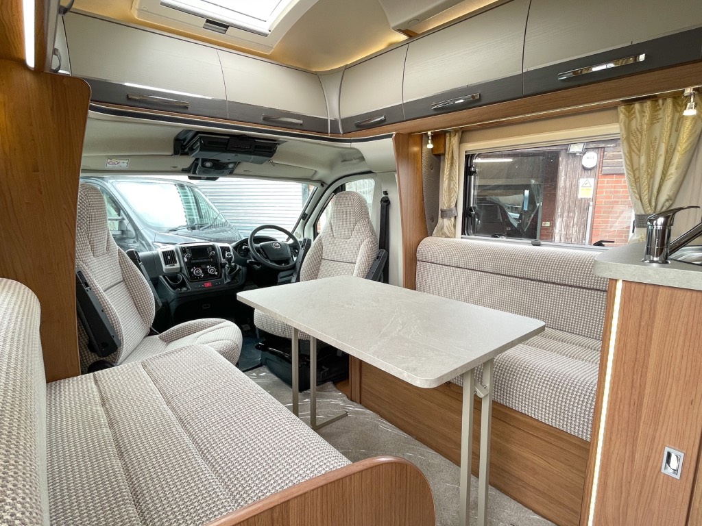 This one has the upgraded Media Pack 2 with touch screen media centre, sat nav, DAB radio, USB and Bluetooth. Also on board is dual fuel heating and water heating along with heated fresh & waste water tanks, rear air suspension, additional leisure battery, towbar, wind out awning, panoramic roof light, drop down Avtex TV, solar panel, cab air conditioning, cruise control, reversing cameras, fitted microwave, cab blinds, kitchen extractor fan, safe, electric step, entrance door with remote central locking, waste bin and umbrella holder, removable carpets, TV aerial, outside BBQ point, driver and passenger swivel seats and much more.