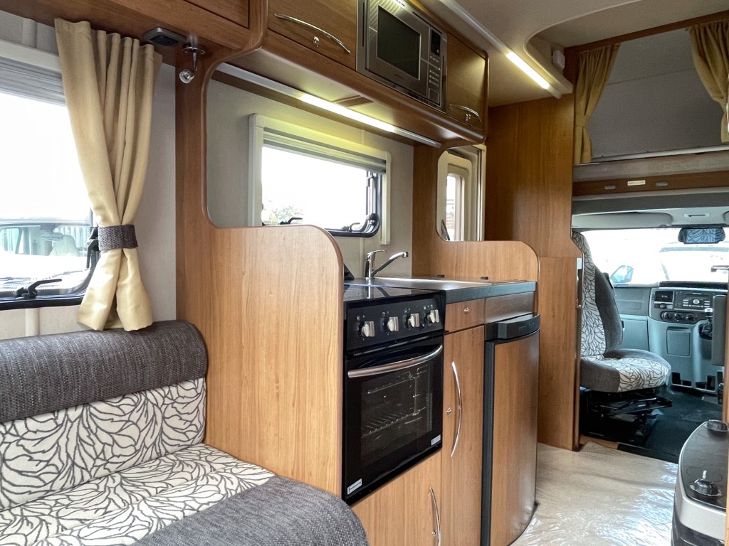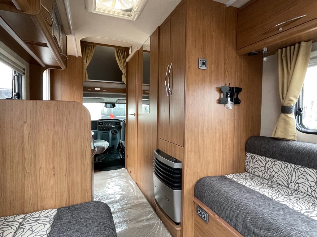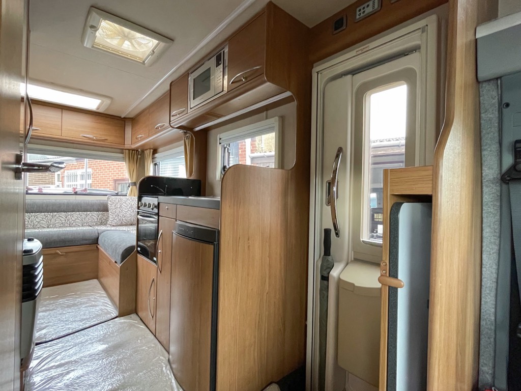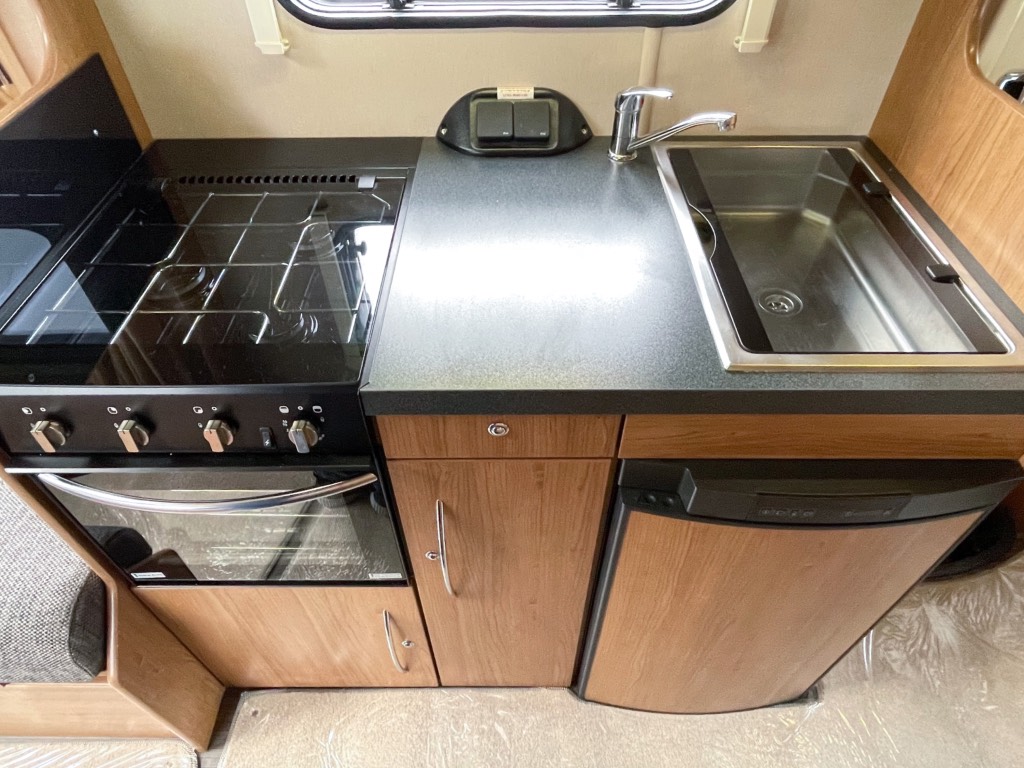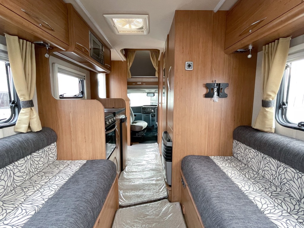 The 625 is a 4 berth featuring the popular U-shaped rear lounge which is perfect for relaxing and dining. This converts into a huge double bed or gives an alternative option of two single beds using the parallel sofas. There is another double bed above the cab which provides useful storage space when not in use. Centrally located is the fully equipped kitchen and opposite this is the bathroom complete with separate shower. This one has Truma heating & water heating and is very well kitted with extras including: an awning, solar panel, bike rack, external shower point, external BBQ point, microwave, TV aerial, cab air conditioning, cruise control, alloy wheels and removable carpets.